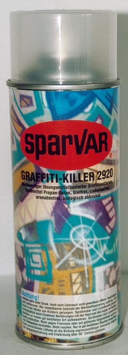 Sparvar Graffiti-Killer für die schnelle Entfernung von Graffitis auf fast allen Oberflächen. Mauerwerk, Holz, Metall, Asphalt, usw. Achtung!! Durch die starke Lösekraft von Sparvar Graffiti-Killer ist eine Prüfung des Anlöseverhaltens auf dem verunreinigten Untergrund, vor dem großflächigen Einsatz unbedingt erforderlich. Testen Sie an einer unauffälligen Stelle ob der Graffiti-Killer die Oberfläche nicht angreift und beschädigt. Nicht auf vinylhaltigem Plastik oder Styropor aufbringen. Je länger die Einwirkzeit des Sparvar Graffiti-Killers auf verunreinigten Flächen ist, desto stärker wird der Untergrund angegriffen. Bei empfindlichen Untergründen empfehlen wir deshalb eine kurze Einwirkzeit von ca.30 Sekunden. Aufgrund der guten Haftung moderner Lacksprays, ist es bei der Entfernung von unerwünschten Graffitis oft nicht zu vermeiden, daß die Oberfläche nach der Graffitientfernung neu gestrichen oder lackiert werden muß. Entfernen Sie das unerwünschte Graffiti so schnell als möglich, da ein ausgehärtetes Lackspray schwieriger zu entfernen ist. In jedem Falle ist eine Entfernung des unerwünschten Graffitis anzuraten, da ansonsten Deckkraftprobleme mit Dispersionsfarben abzusehen sind.
